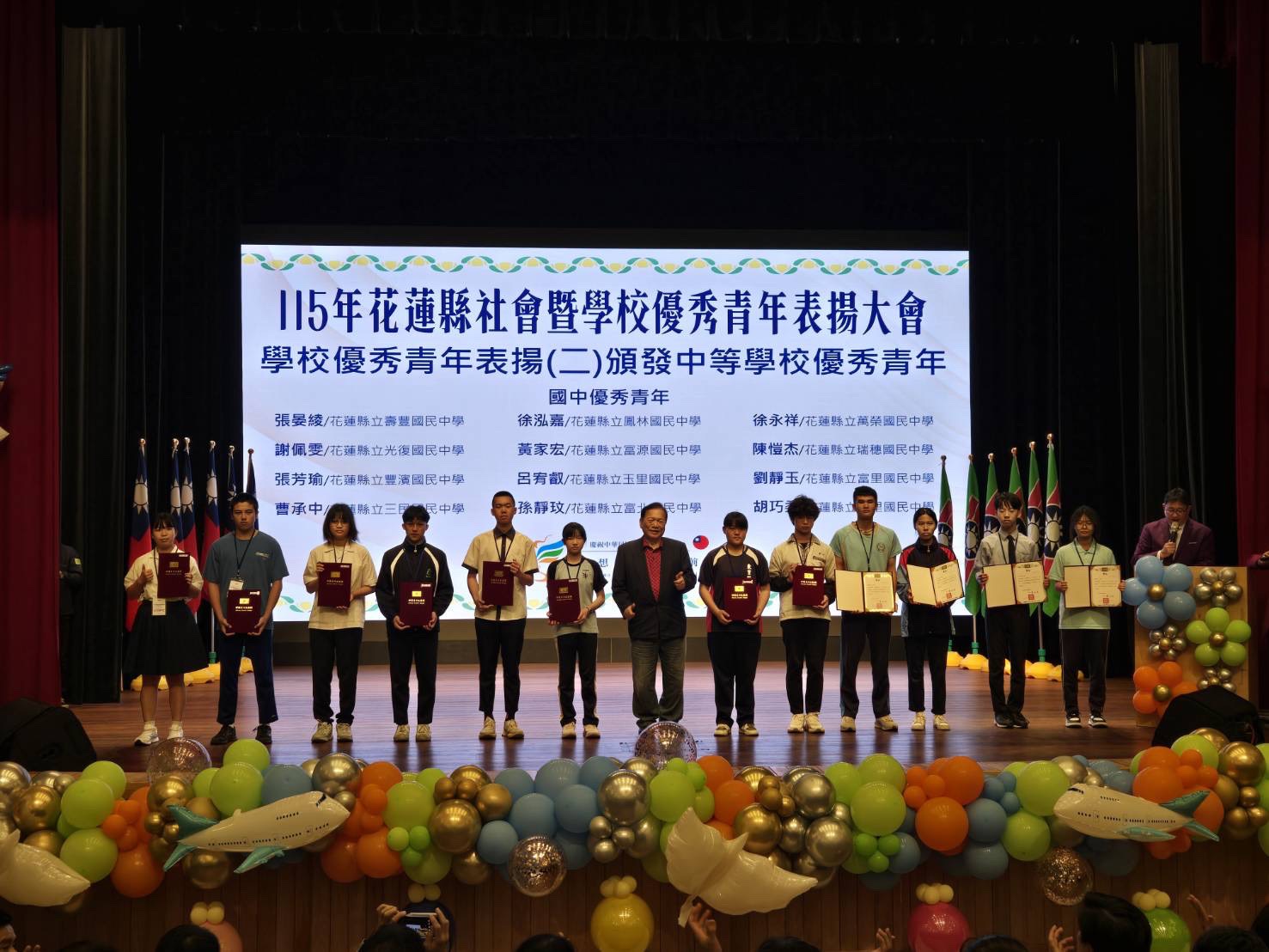 高中優秀青年獲獎者包括:楊子婷(花蓮女中)、楊惠雯(花蓮高商進修部)、孫睿嶸(花蓮高工)、刁秋玲(蓮高工進修學校)、古正浩(花蓮高農)、吳妤萱(花花蓮特殊教育學校)、林浩鈞(四維高中)、簡希臻(海星高中)、周澤恩(慈濟大學附屬高中)、陳韋皓(上騰高中)等10位,他們在學術、品德、服務等各方面皆表現優異。國中優秀青年則由來自全縣各校的菁英獲選,包括:吳芳妤(秀林國中)、李冠勤(新城國中)、林祖安(美崙國中)、張沄榕(宜昌國中)、潘可婕(自強國中)、王安婕(花崗國中)、潘亮霓(國風國中)、鄒冠云(國風國中)、張晏綾(壽豐國中)、徐泓嘉(鳳林國中)、徐永祥(萬榮國中)、謝佩雯(光復國中)、黃家宏(富源國中)、陳愷杰(瑞穗國中)、張芳瑜(豐濱國中)、呂宥叡(玉里國中)、曹承中(三民國中)、劉靜玉(富里國中)、胡巧柔(東里國中)、孫靜玟(富北國中)、陳瑋嘉(慈濟大學附屬高中國中部)、陳恩芃(花蓮特殊教育學校國中部)、許筱宓(海星高中國中部)等23位,這些優秀學子在各自領域展現出色的潛力與能力。